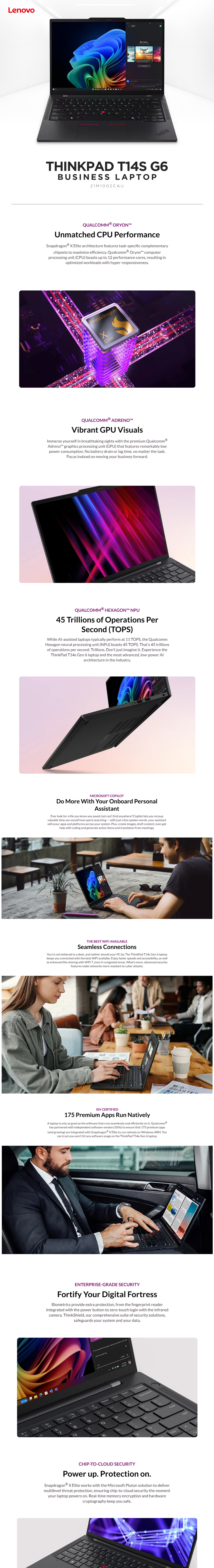 Get crystal-clear audio on your conference calls with noise-cancelling mics, stereo speakers, and Dolby Audio™ tuned to enhance what you hearand how you sound. Plus, with the optional Copilot Premium, you can even get meeting recaps and translations. With the Qualcomm® Hexagon™ neural processing unit (NPU), the ThinkPad T14s Gen 6 boasts extreme power efficiency - no matter the workload. Work wherever you are without electrical outlets. True multiday (1 day = 24 hours) battery life provides assurance that productivity won't suffer when you're on the road, in the field, or taking to the skies. -